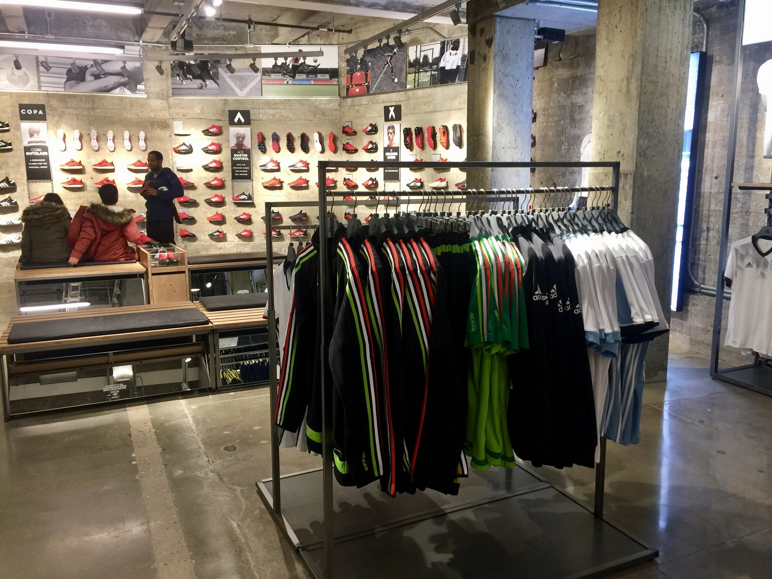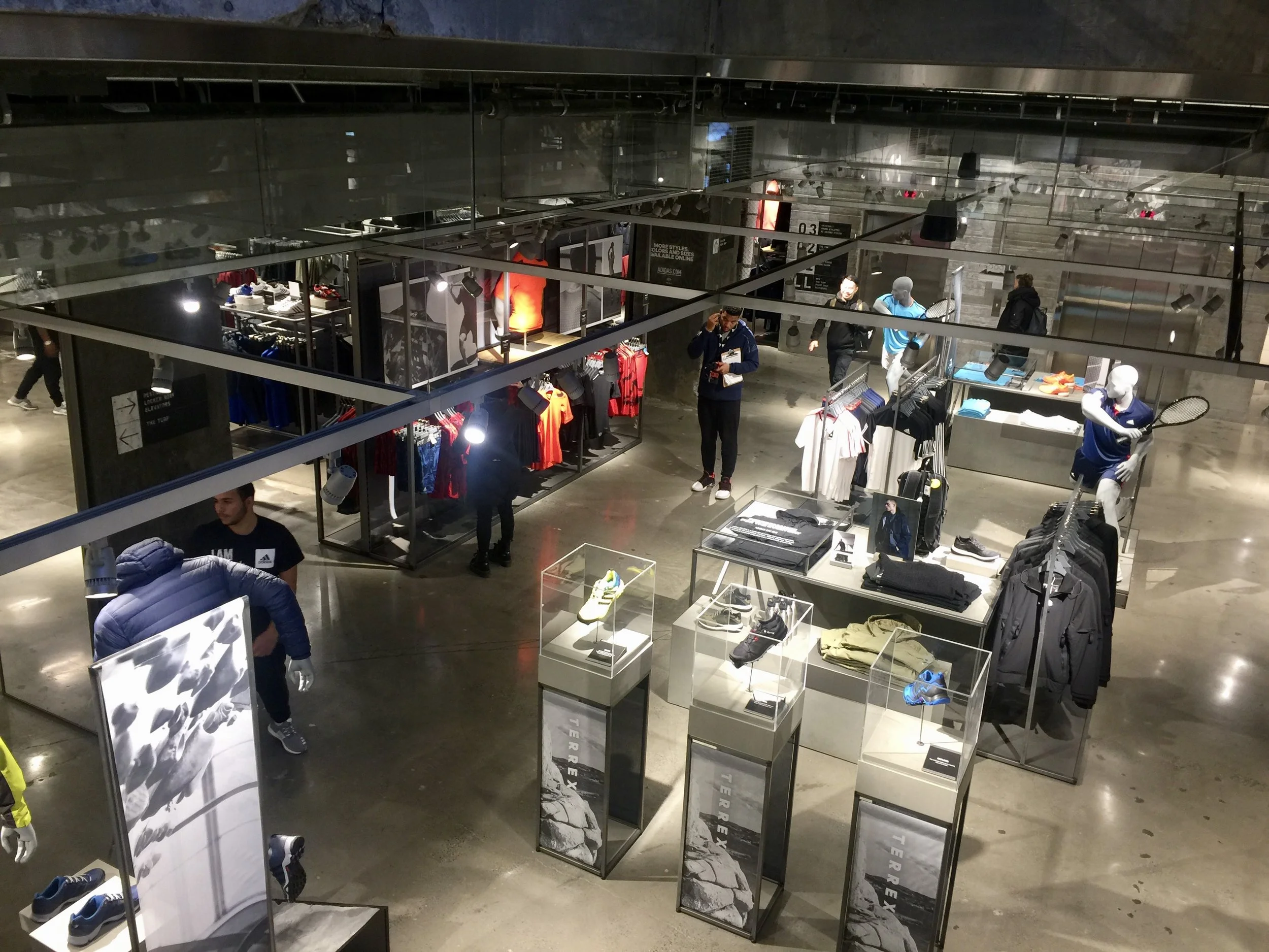 - Divisão por gênero, esporte e categoria: o subsolo é inteiro dedicado ao público masculino, com os produtos separados por esporte, coleções especiais e funcionalidade (ex: roupas de compressão). No 1º andar: lançamentos, concierge, estações de realidade virtual e juice bar. 2º andar: feminino, coleção Stella McCartney, bra bar. 3º andar: linha Adidas Originals, tênis casuais, colaborações especiais, linha infantojuvenil.