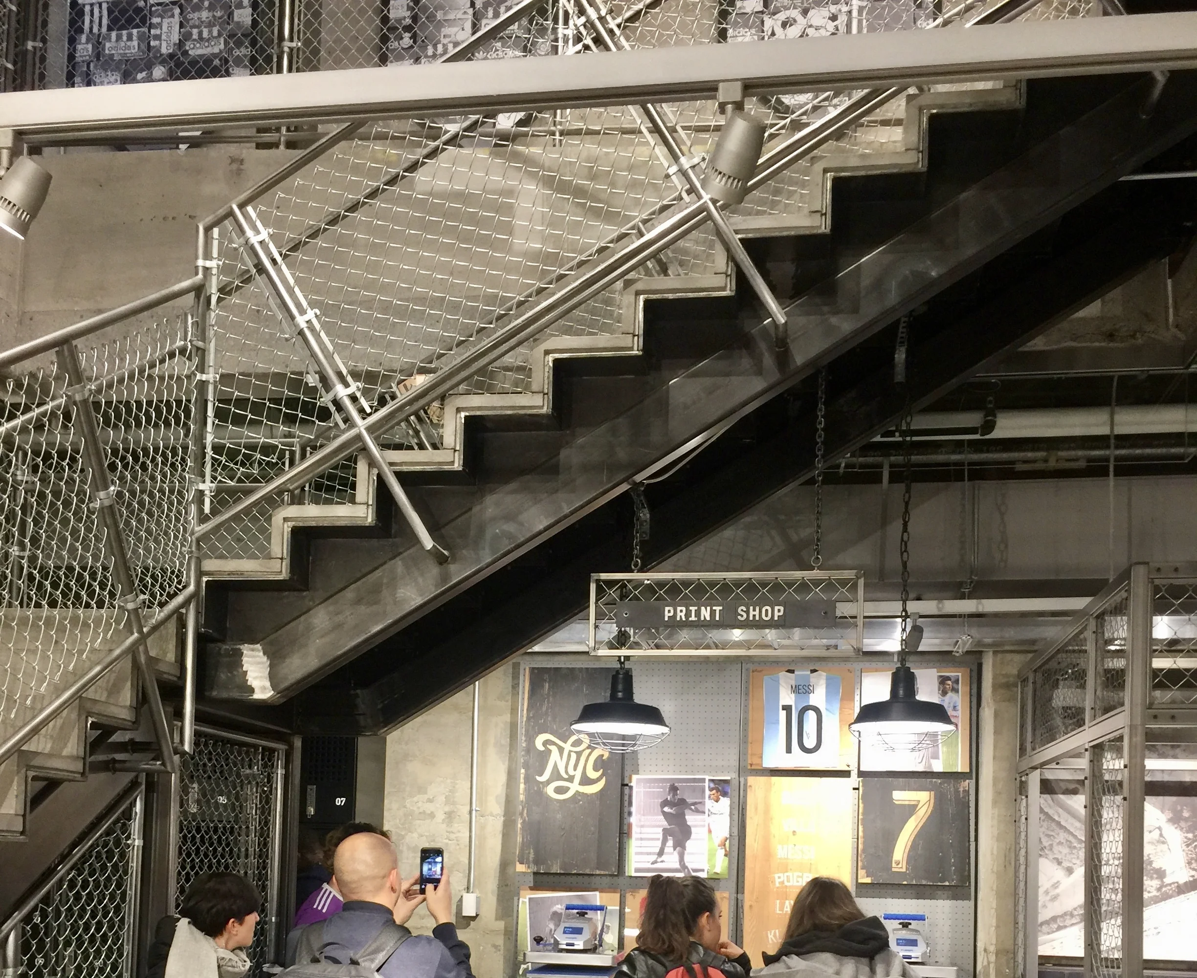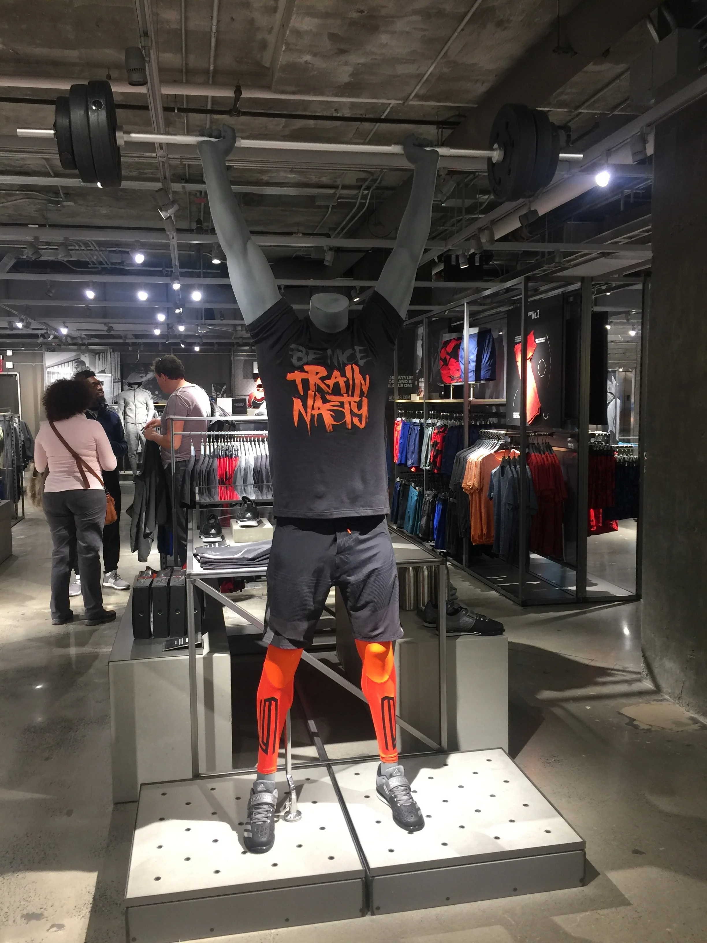 A loja de quatro andares e mais de 4 mil m2, reproduz um ginásio de colégio (estilo americano). A entrada é feita através de um "túnel", as escadas são de cimento, os caixas foram feitos para parecerem bilheterias, os provadores imitam vestiários, há bebedouros espalhados pela loja, e por aí vai. Mais uma vez observamos aqui o foco tanto em oferecer experiências ao cliente, quanto em vender produtos. O sucesso das lojas físicas está cada vez mais atrelado ao que estas podem oferecer além da capacidade das lojas virtuais.