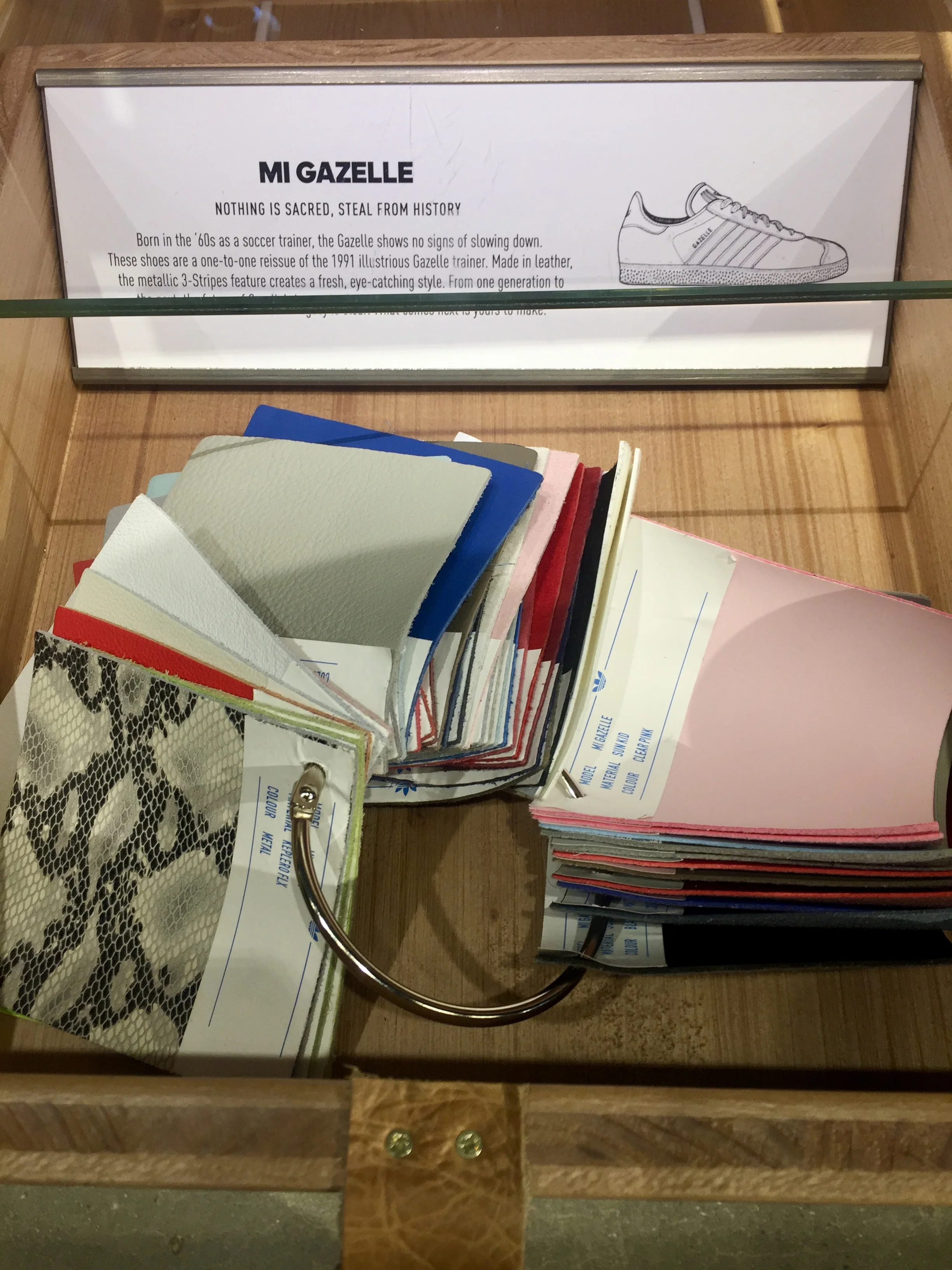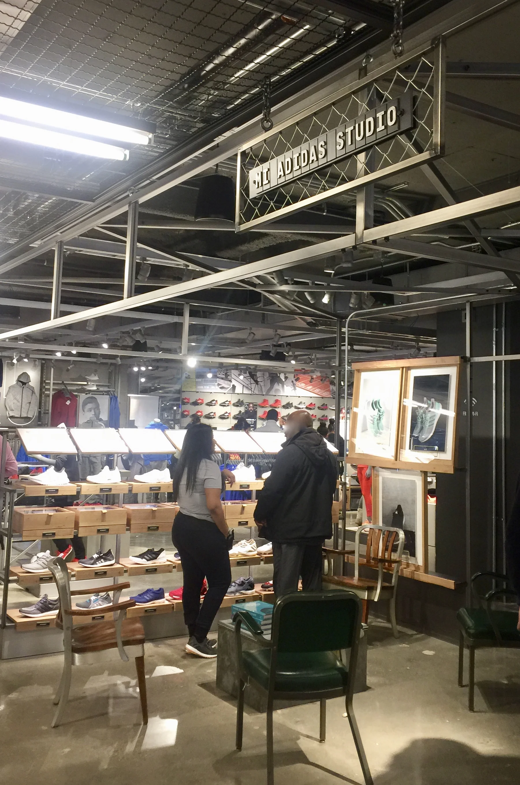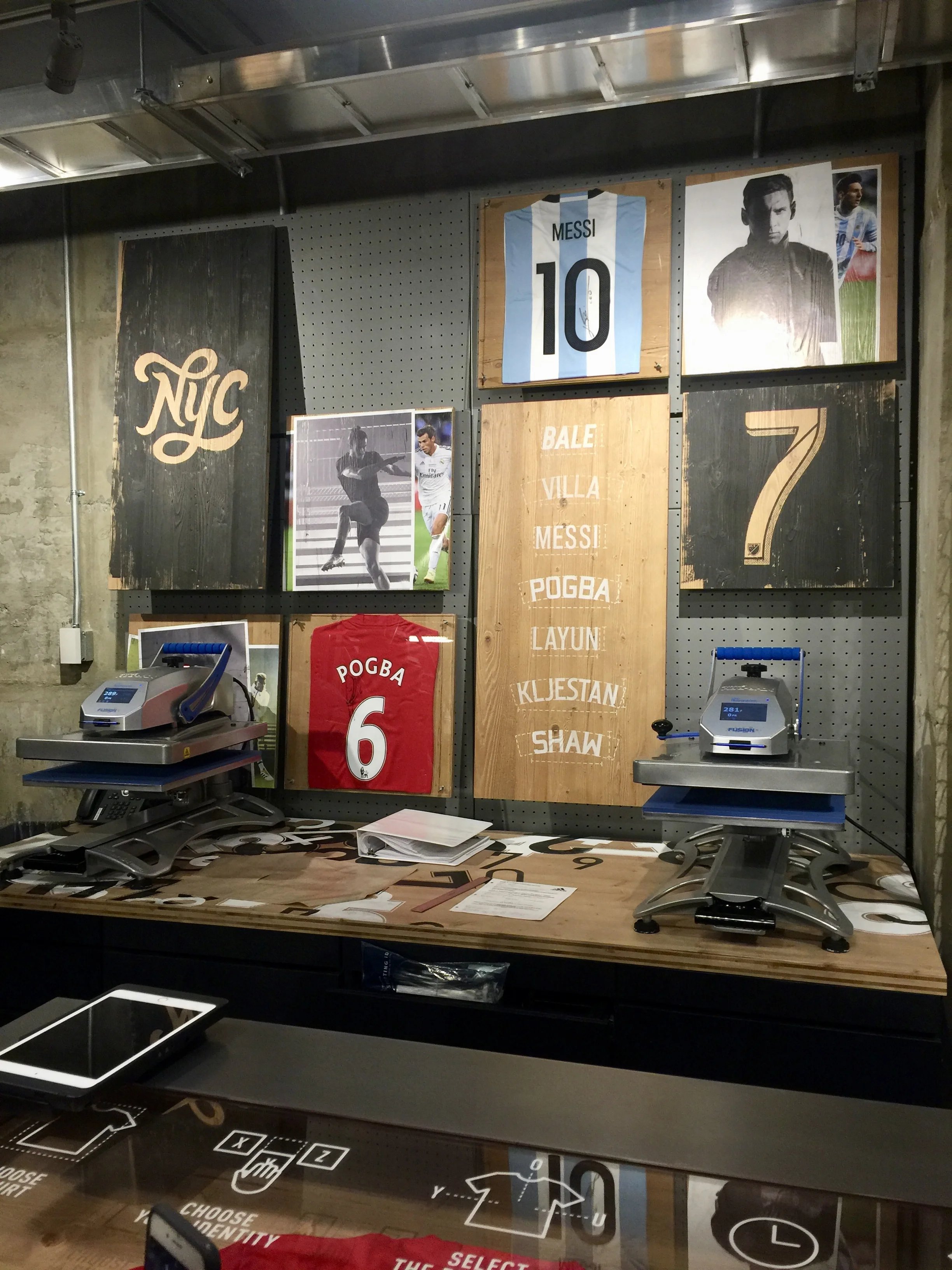 7. Estações de customização: existem duas estações para customização de produtos na nova loja da Adidas. Na localizada no subsolo, junto à coleção masculina, é possível estampar nomes e números em qualquer camiseta comprada na loja, por uma taxa adicional, em não mais do que 15 minutos. No último andar, o "Mi Adidas Studio" permite a criação de modelos exclusivos de praticamente todos os sapatos da marca. É possível escolher cores, estampas e detalhes especiais do tênis por uma adição de aproximadamente 10% ao preço do produto original.