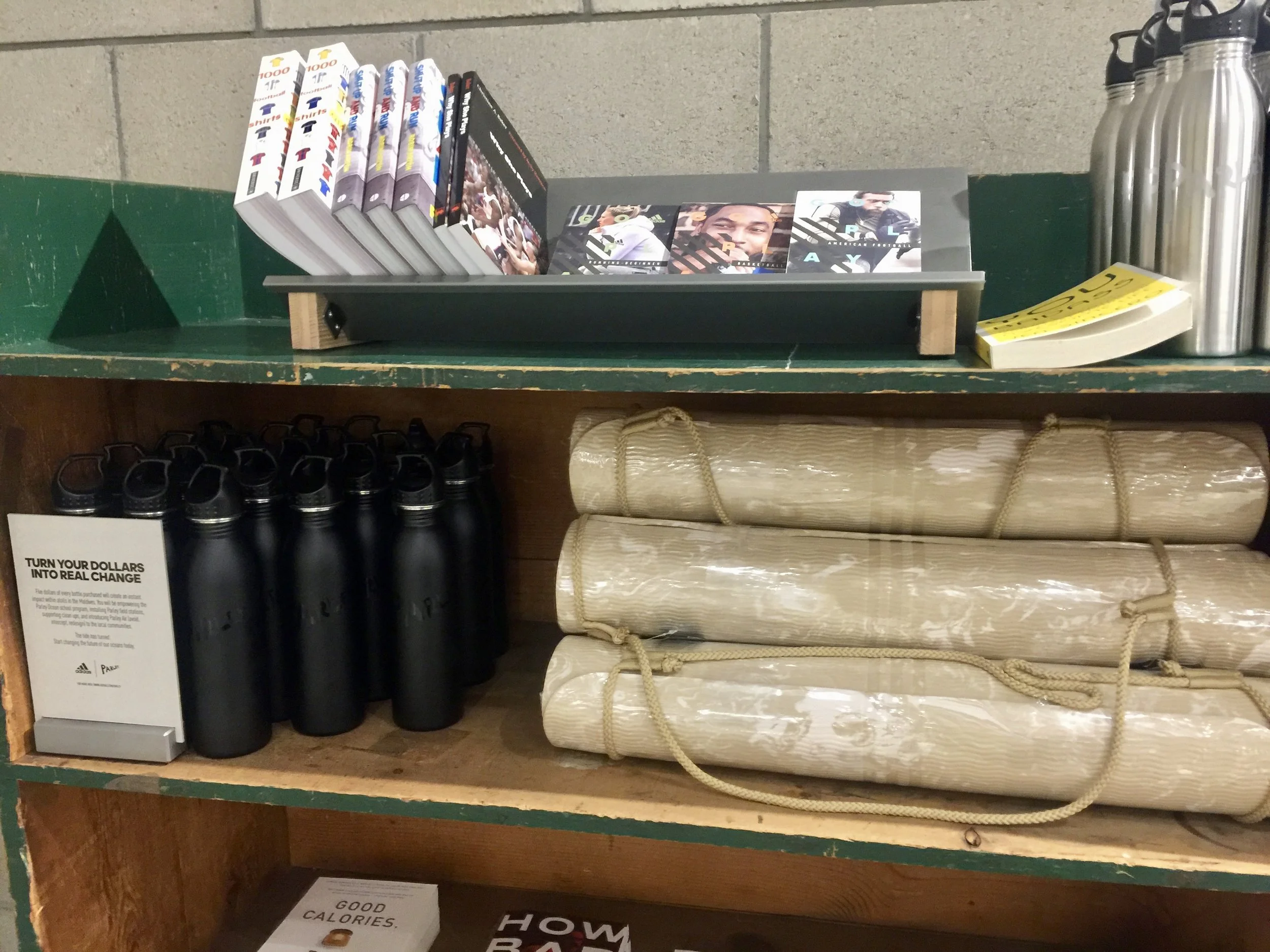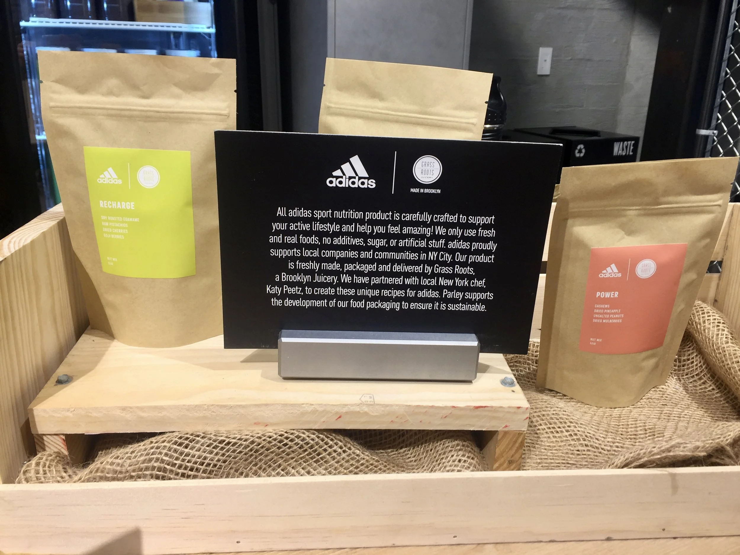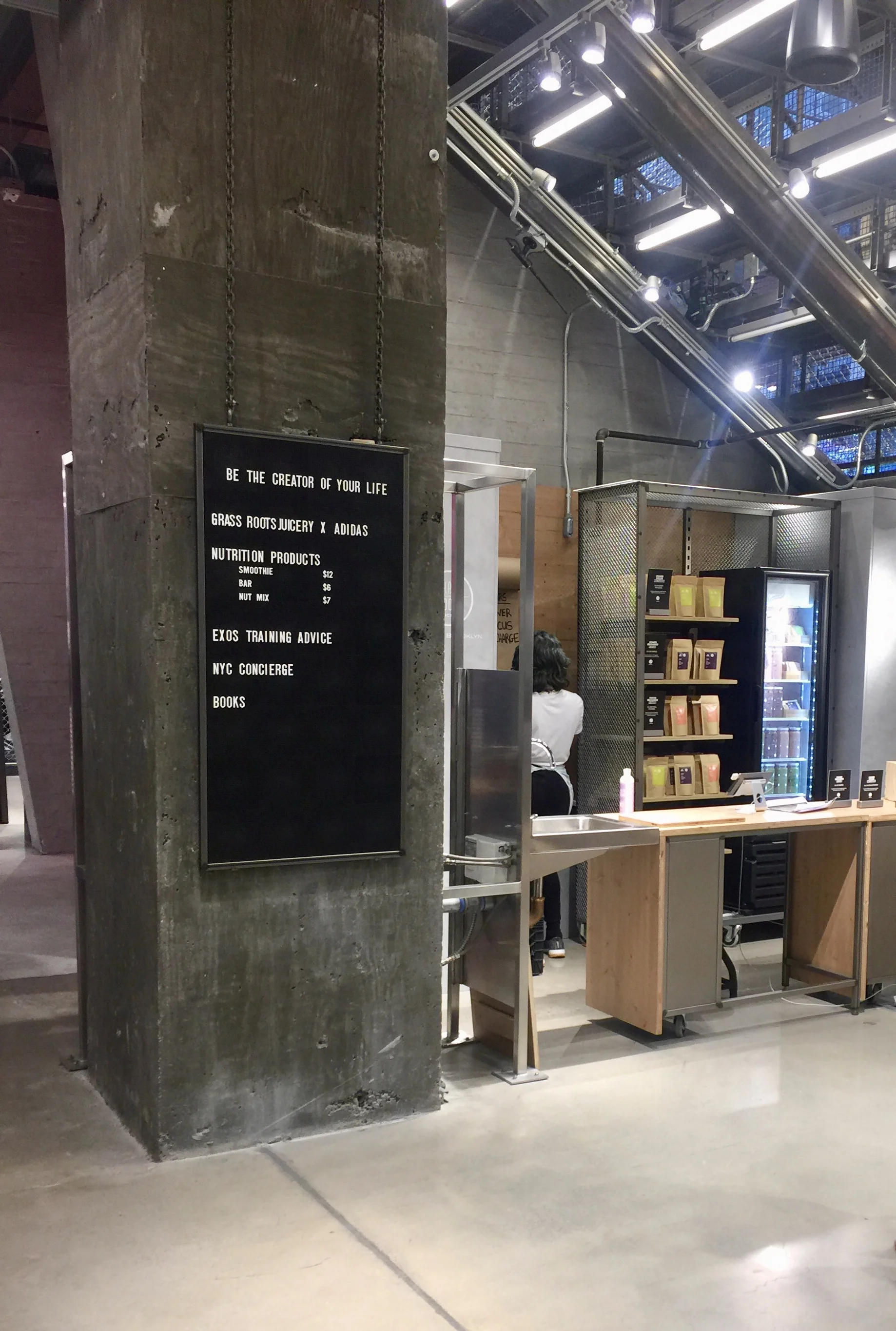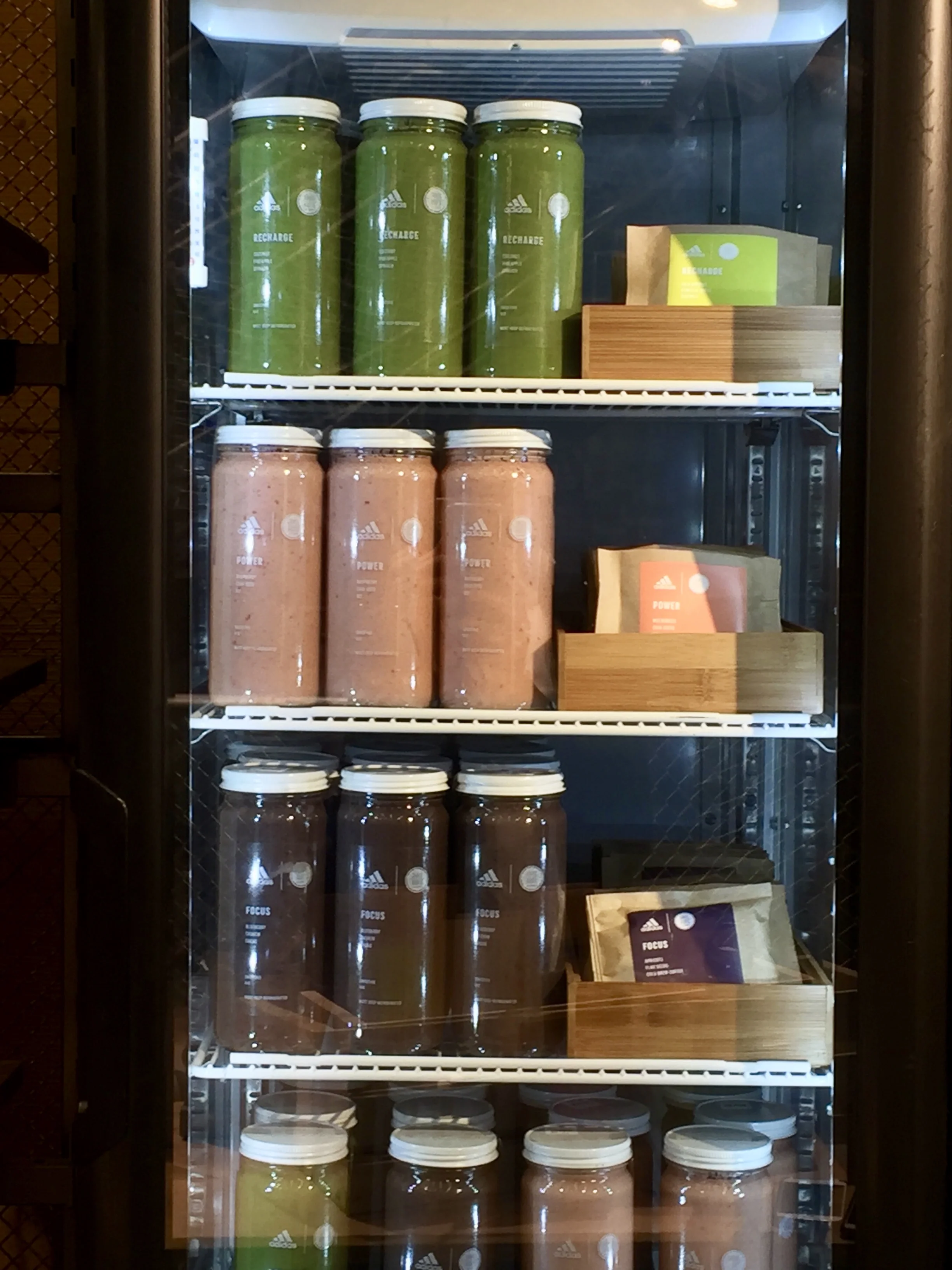 4. Grass Roots shop: loja de sucos, barras de cereal e granolas no 1º andar. Os produtos foram desenvolvidos pela Grass Roots, que é uma loja de alimentos saudáveis do Brooklyn, exclusivamente para a Adidas. Tudo 100% fitness.