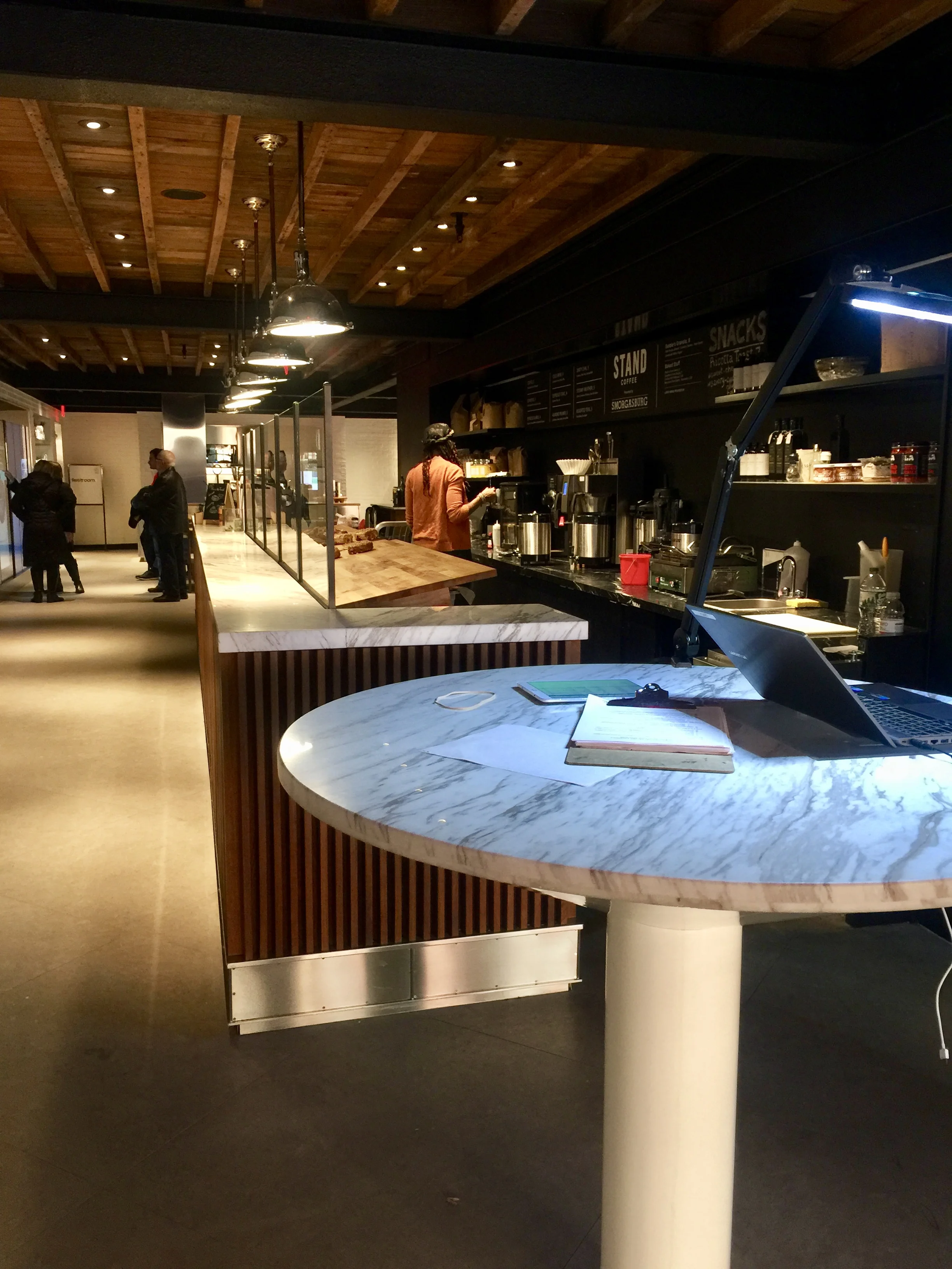 O café que fica no piso superior é administrado pela Smorgasburg, a famosa feira gastronômica do Brooklyn que une diversos vendedores de comida em um espaço só. Para o café da Samsung, são oferecidos uma variedade de cafés, chás, doces e sanduíches de alguns dos principais vendedores da feira. Você pode sentar para tomar o seu café em uma das mesas espalhadas pela loja enquanto observa as pessoas testando os produtos ou, se preferir, carregue o café com você enquanto explora os diferentes gadgets e ambientes.