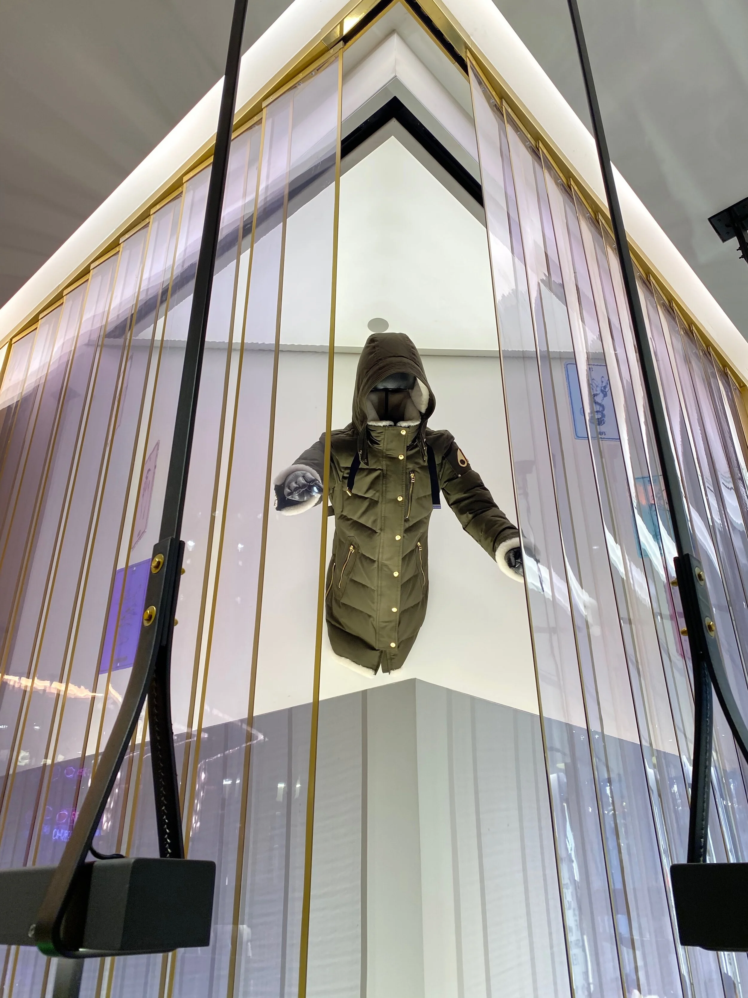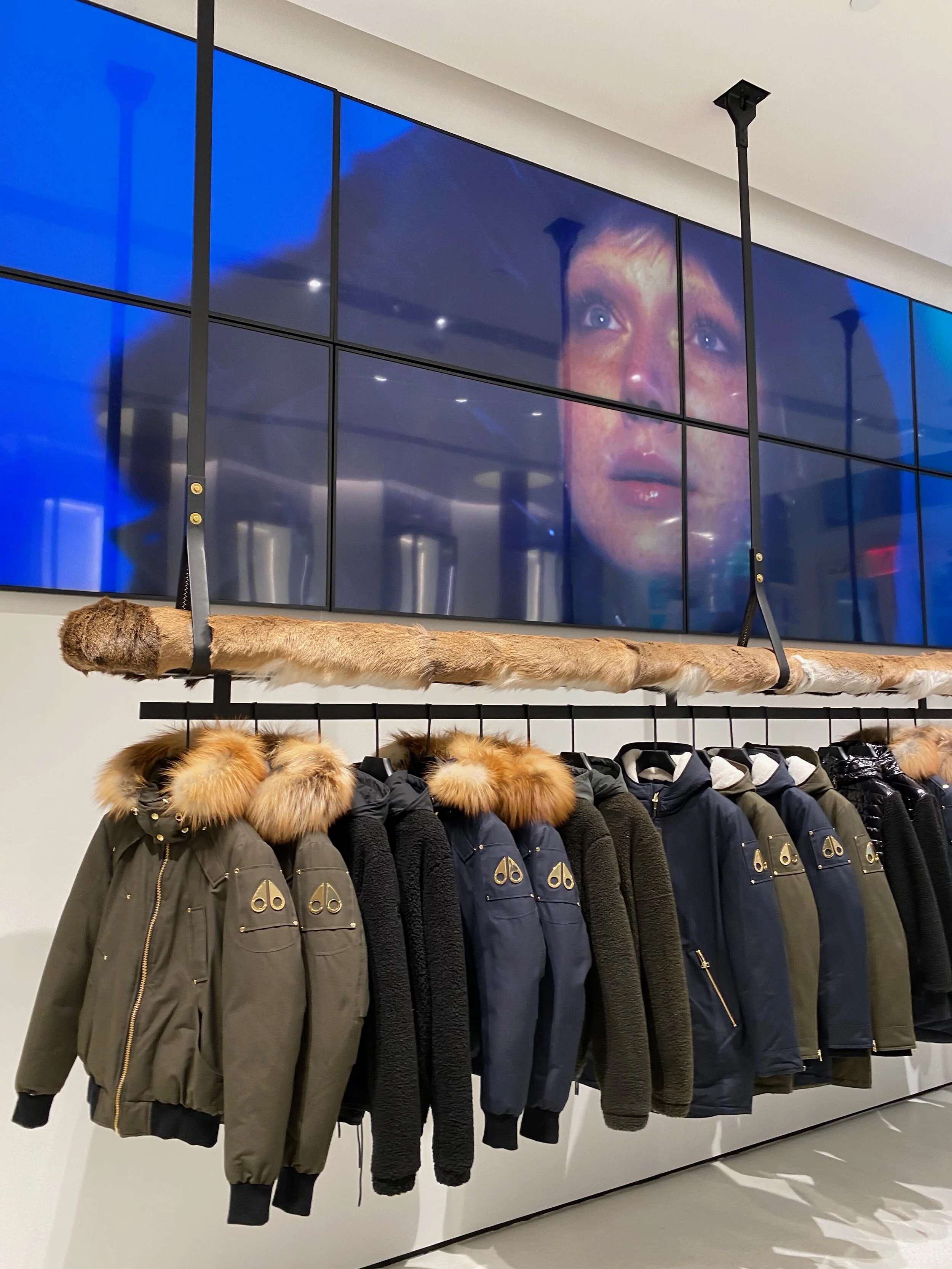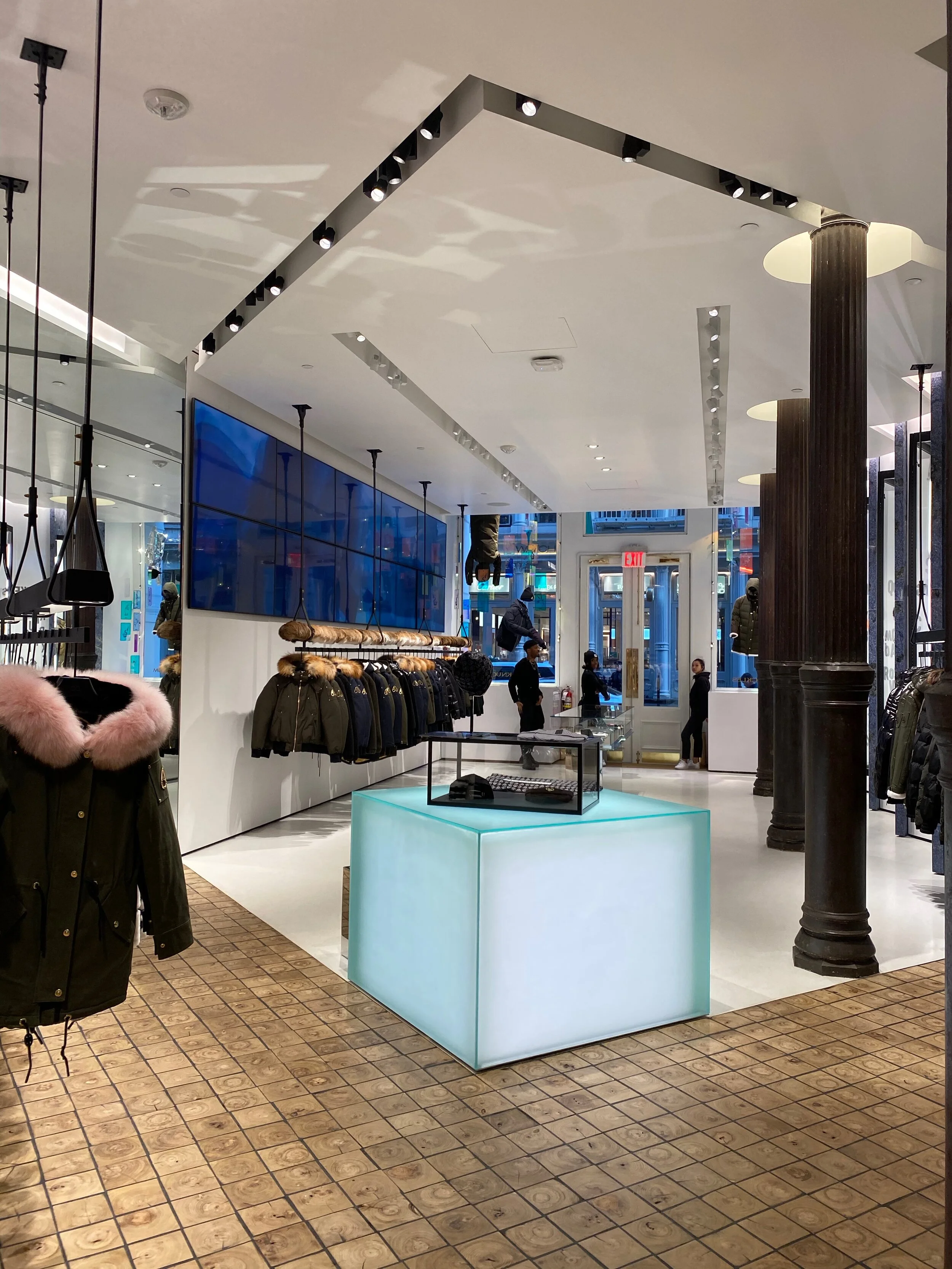 E assim foi também na Moose Knuckles, a marca canadense de casacos de neve que chegou com sua primeira flagship dos EUA em novembro de 2019. Entrar na loja, localizada no coração do Soho em NY, é como entrar em uma galeria de arte, com a única diferença que, no lugar dos quadros, estão expostos os casacos mais icônicos da marca.
