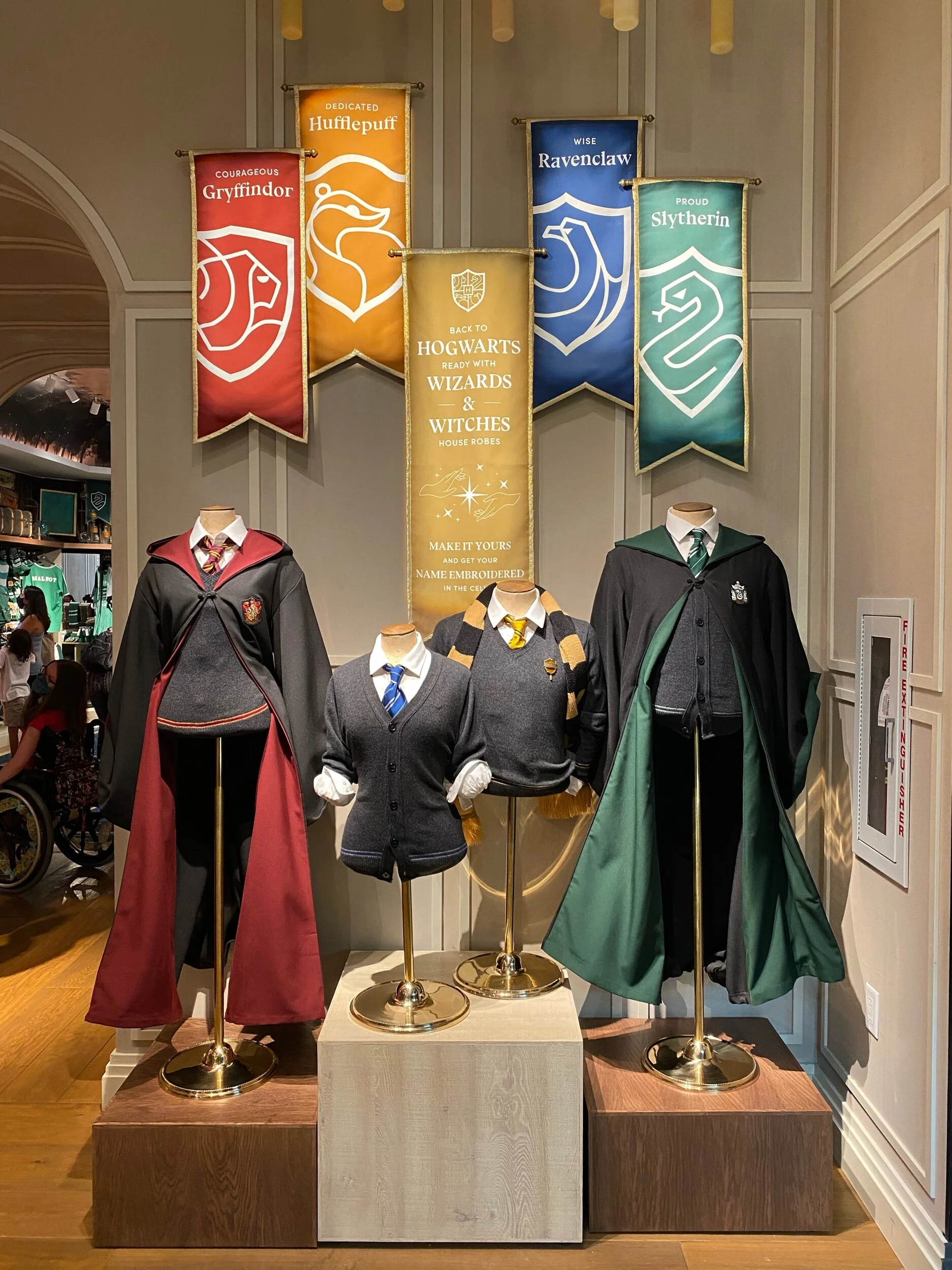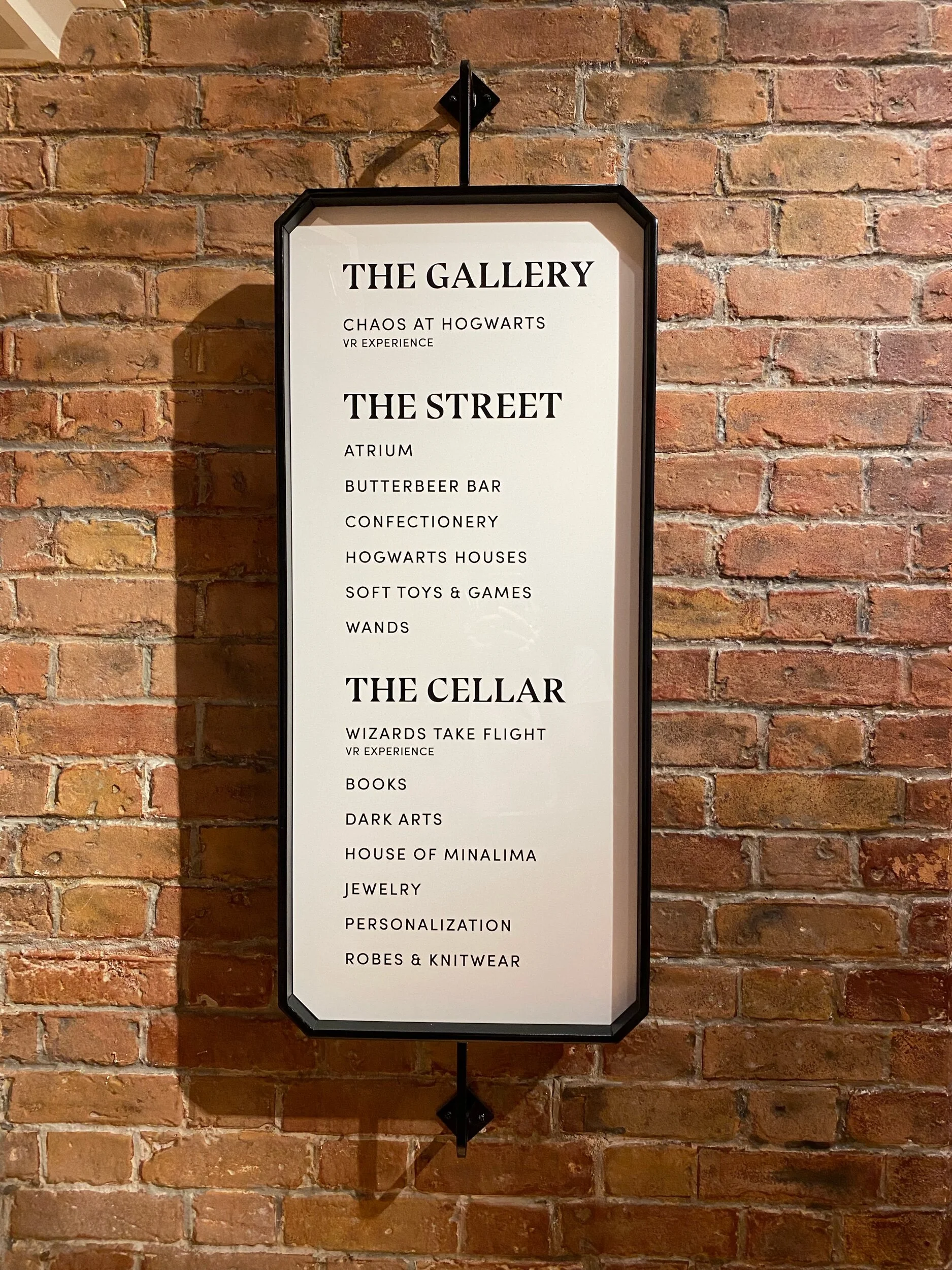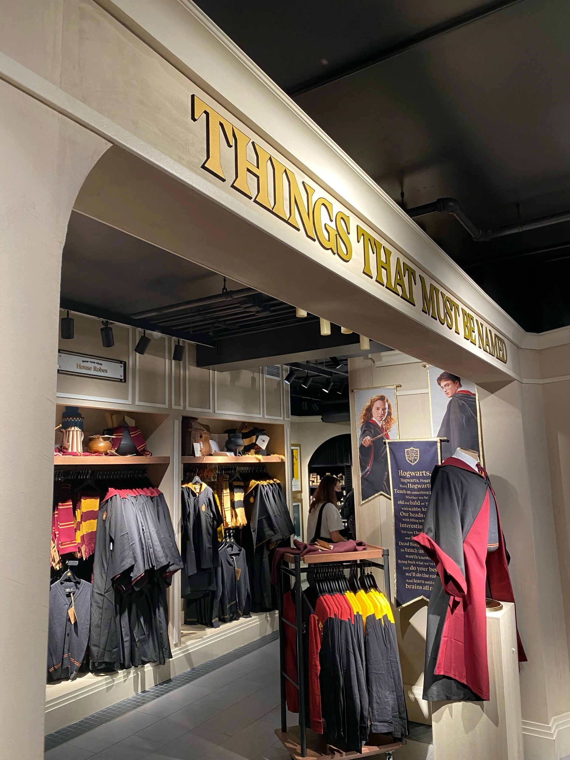 Na entrada, ficam as salas de cada uma das “casas” da escola de bruxaria com uma infinidade de produtos que vão desde lápis e garrafas de água até os uniformes de cada uma. Tem também a sala das varinhas onde é possível conhecer as características de cada uma e até duelar com outros bruxos através de displays interativos.